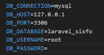 buka file .env kemudian isikan konfigurasi datababse berikut ini.