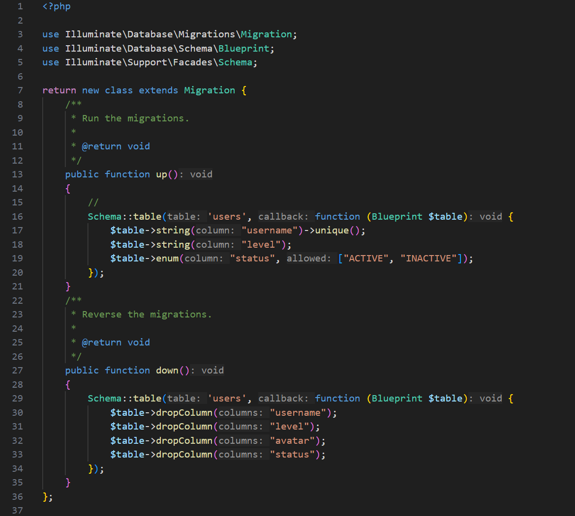 status, maka perlu membuat sebuah migration untuk menambahkan field-field diatas,
