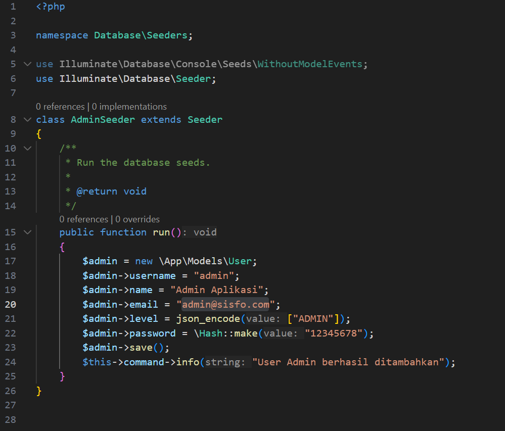 seeding pada Laravel, buat seeder dengan nama AdminSeeder dengan perintah :