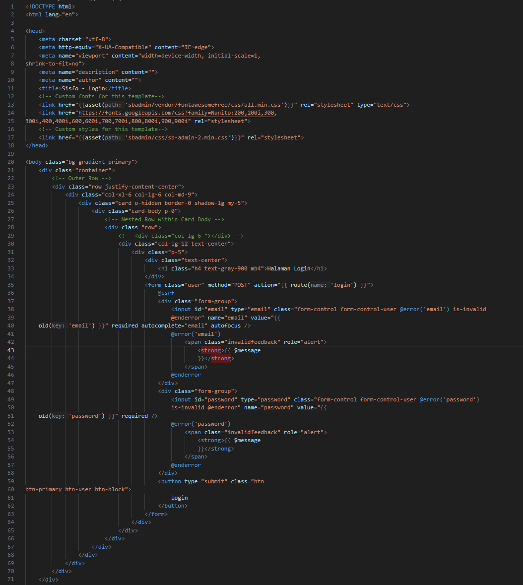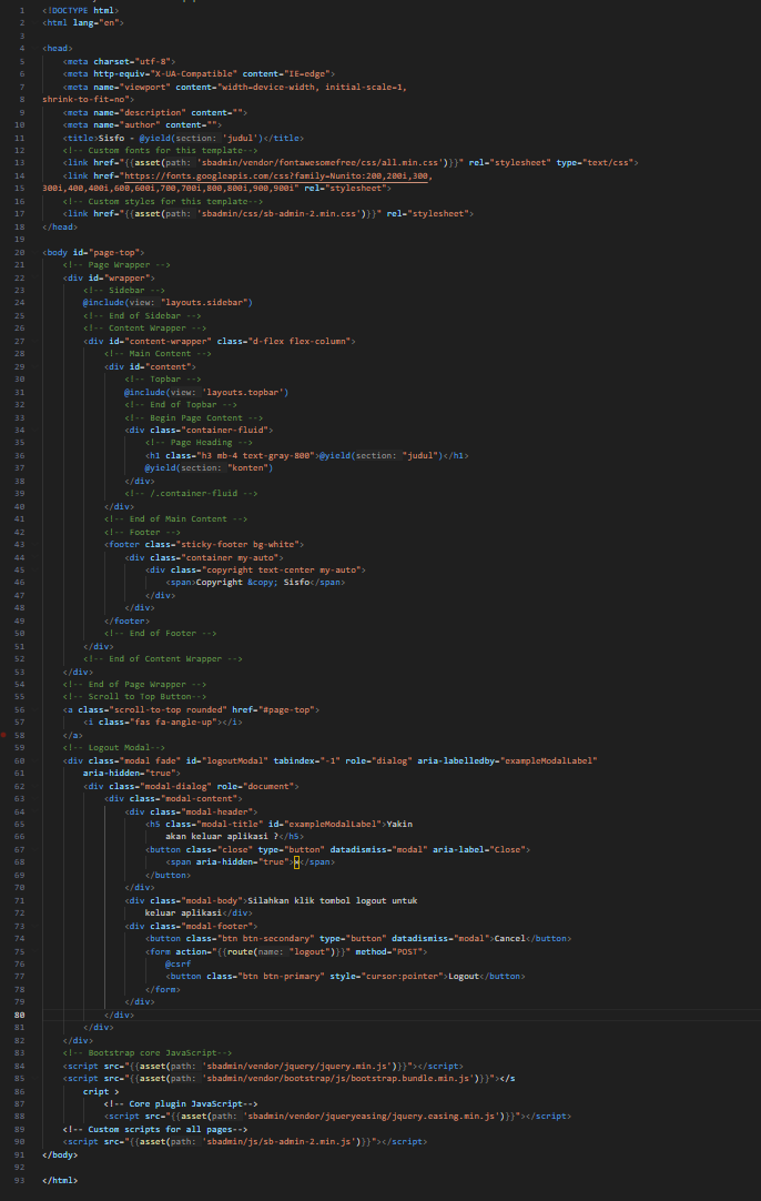 Buka file app.blade.php pada folder view/layouts kemudian ganti dengan kode program