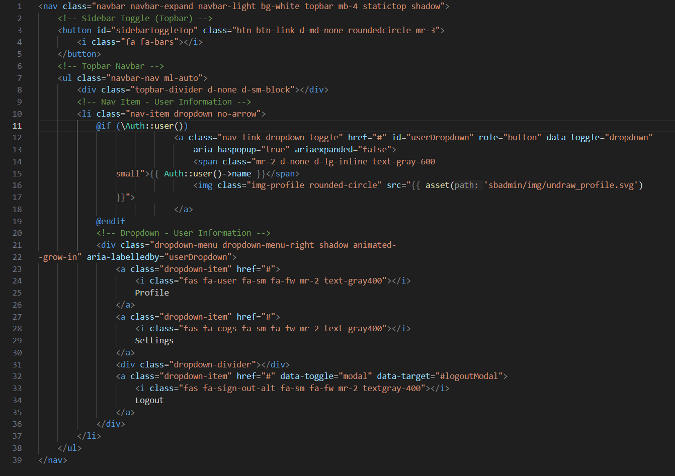 Buat file pada folder layouts dengan nama topbar.blade.php dan isi dengan kode program berikut.