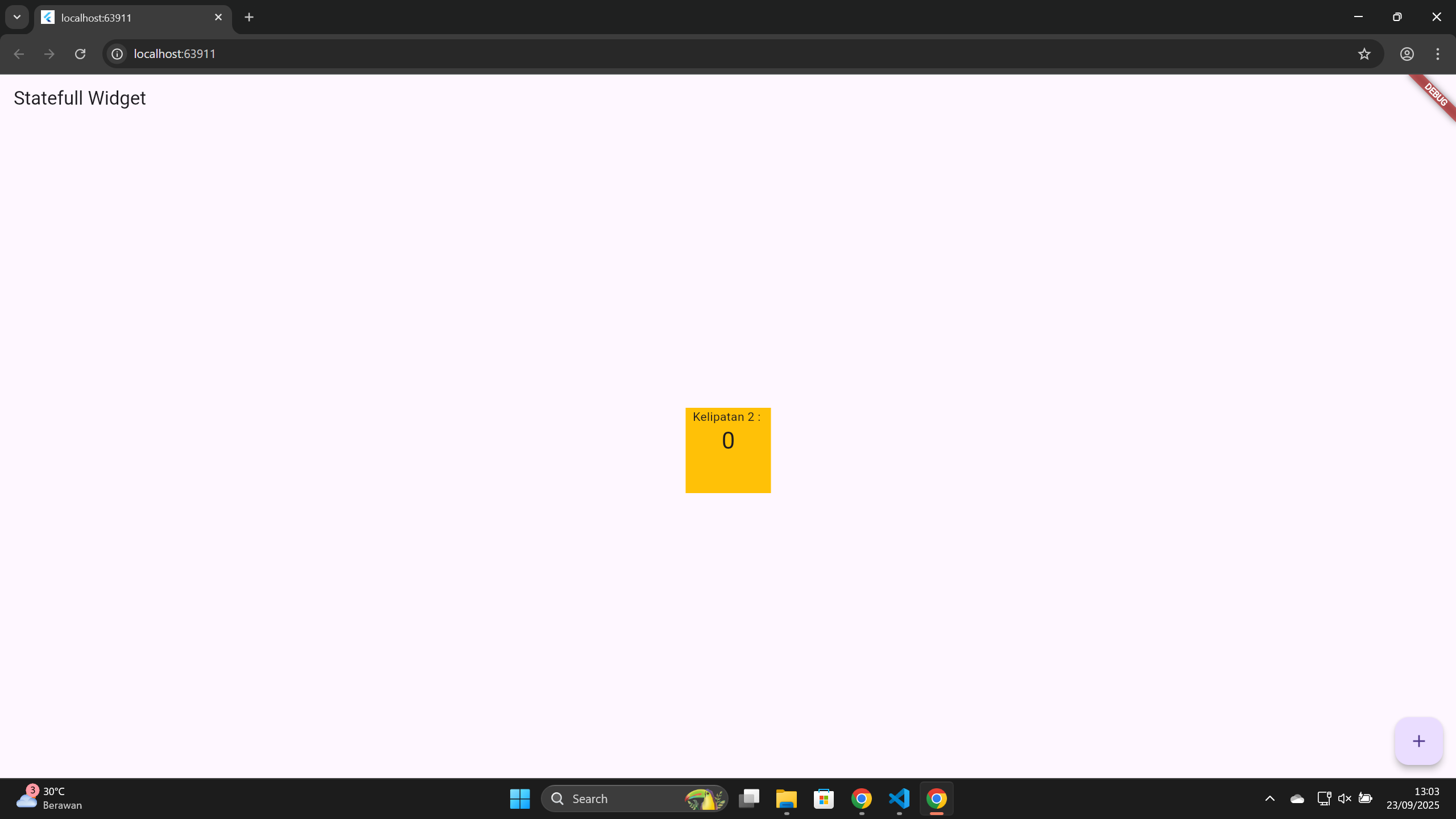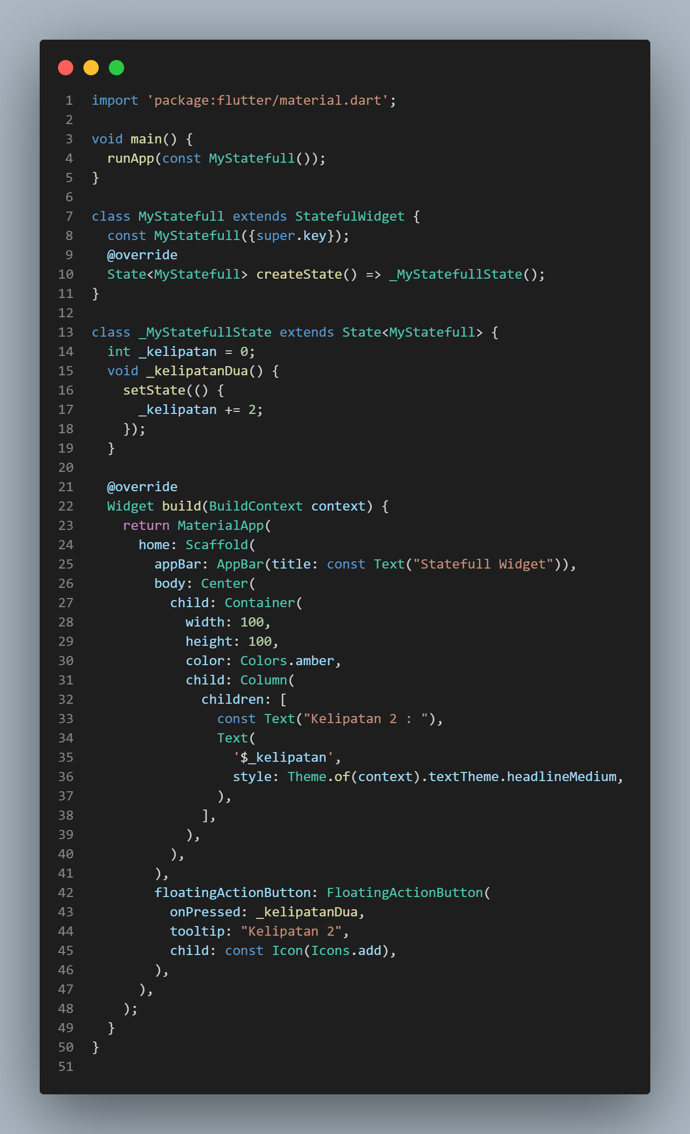 Stateful Widget adalah widget dinamis yang bisa berubah saat ada event atau state berubah.
