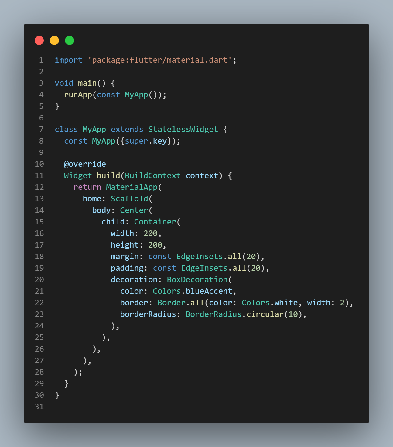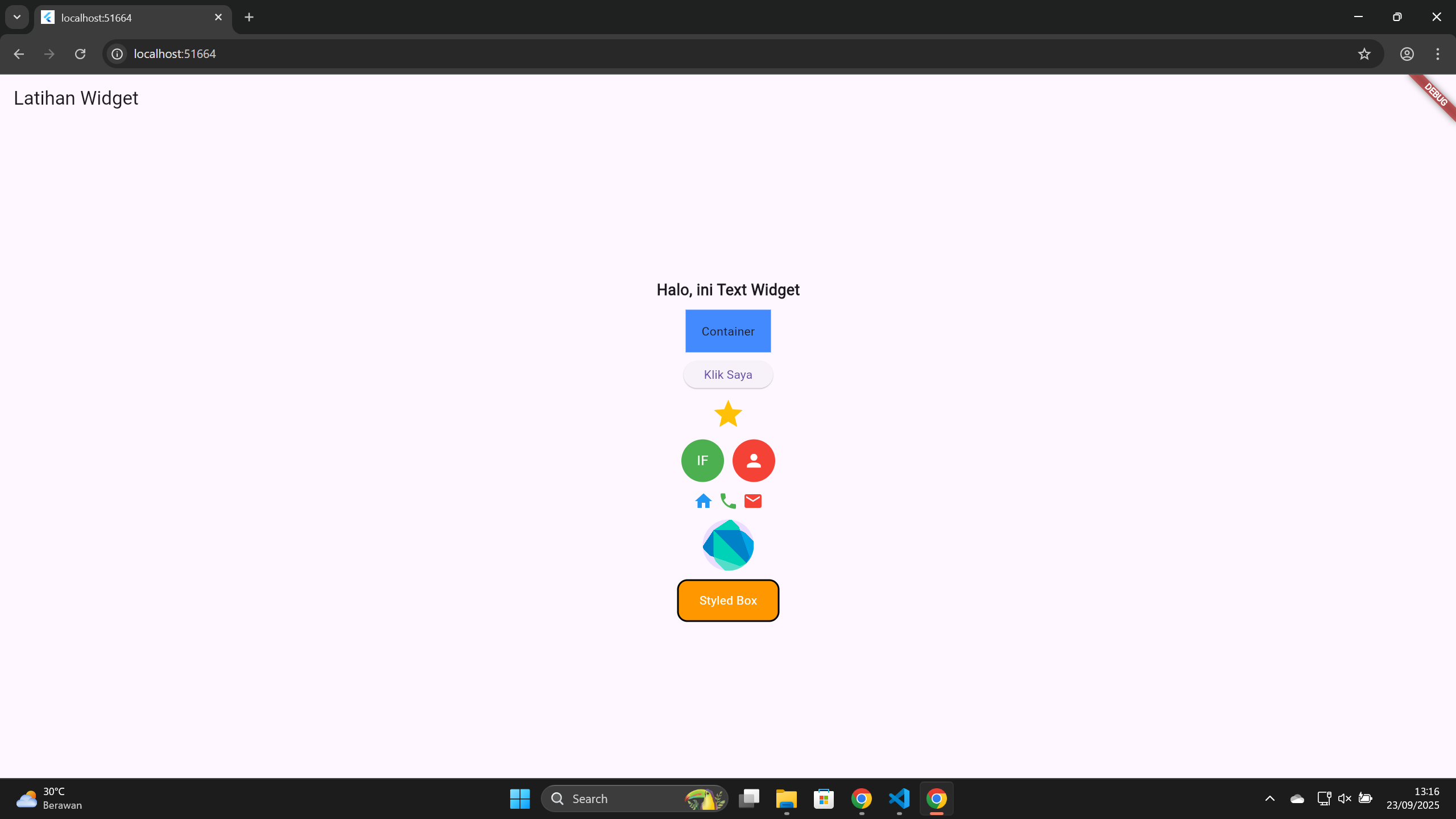 - Container → kotak dengan ukuran, warna, padding, margin.