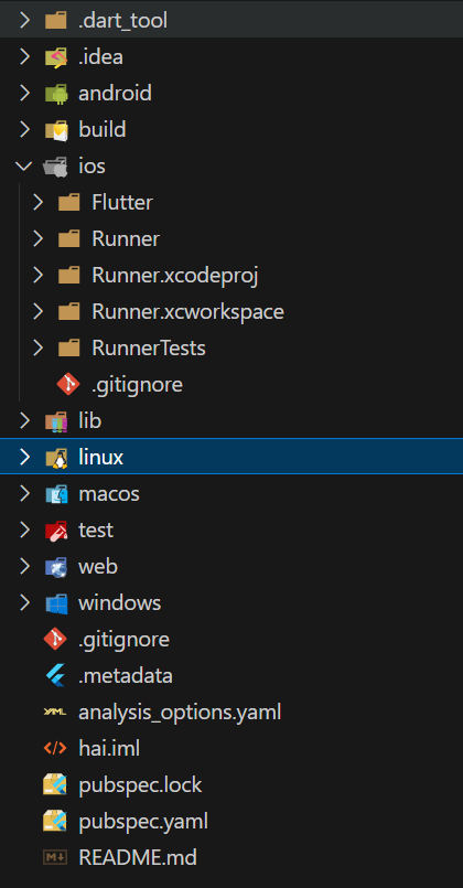 Struktur project Flutter terdiri dari folder lib/, android/,