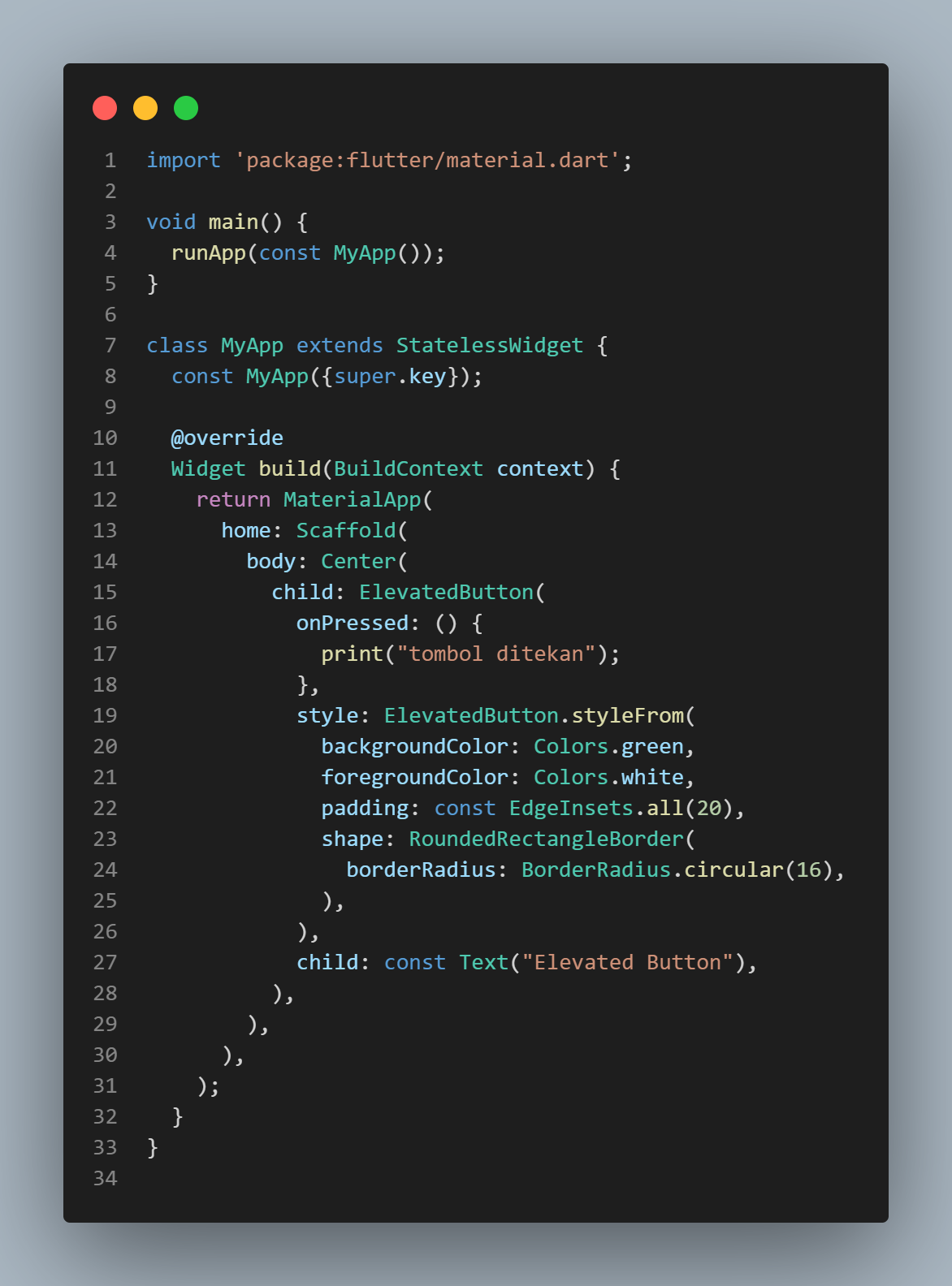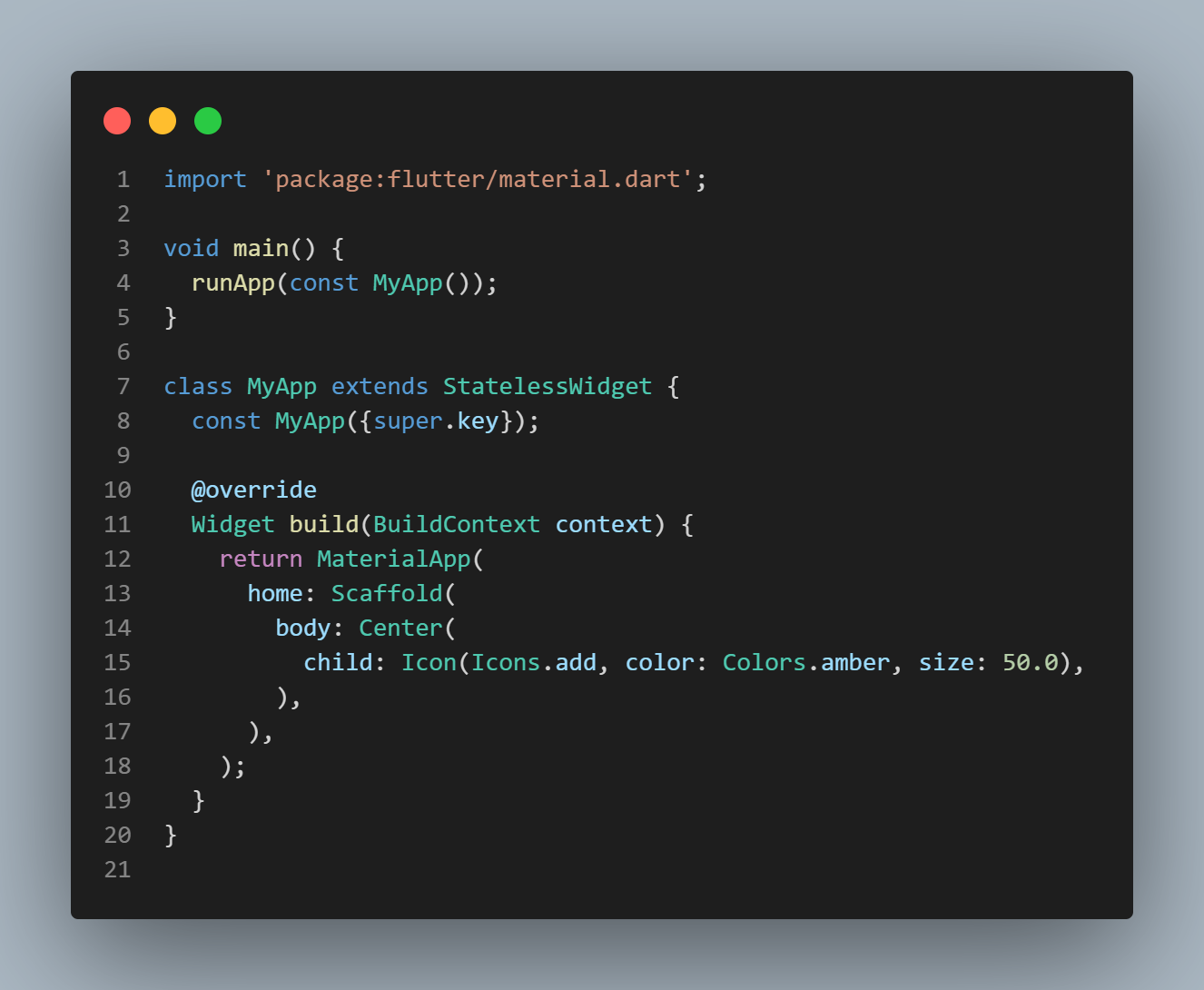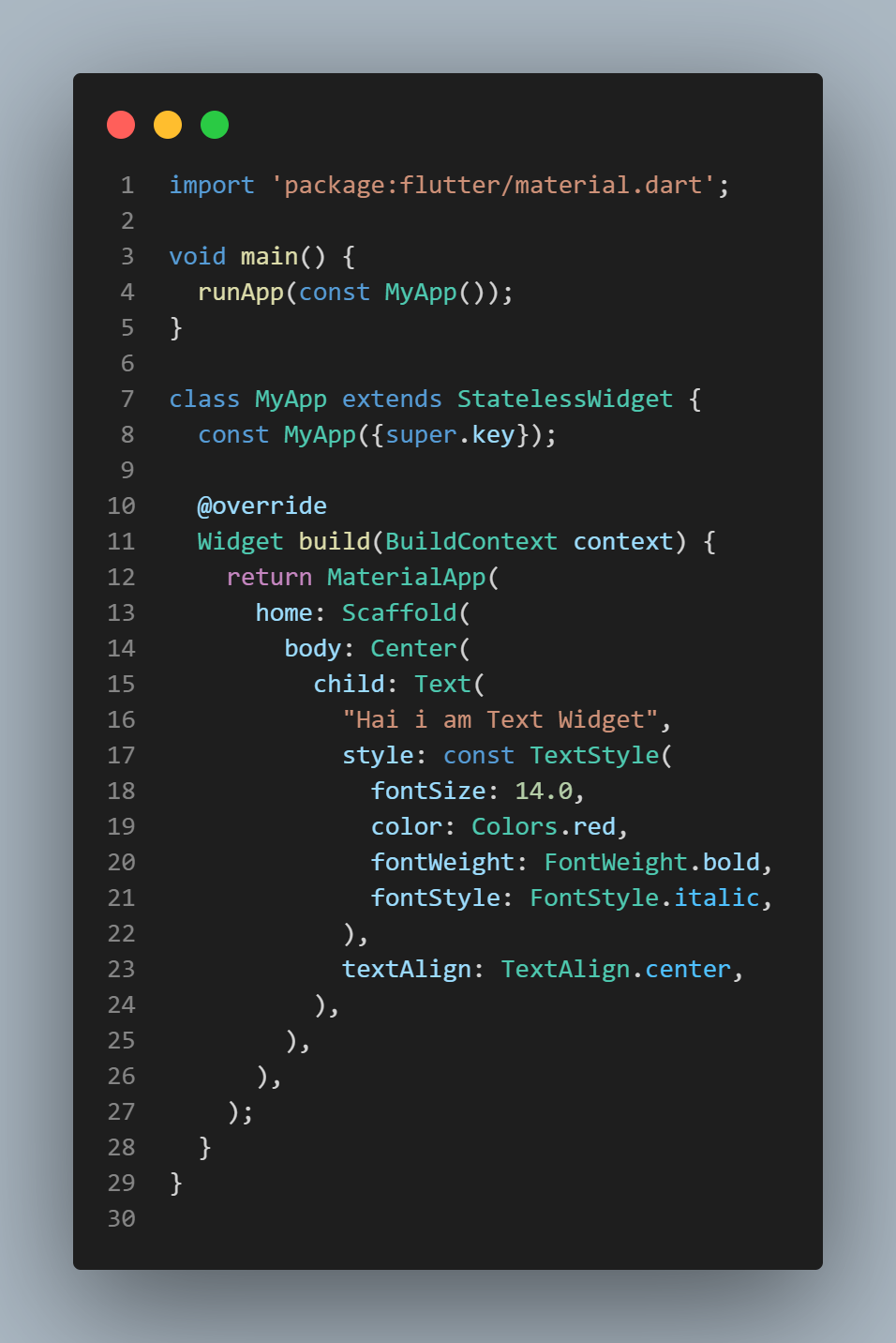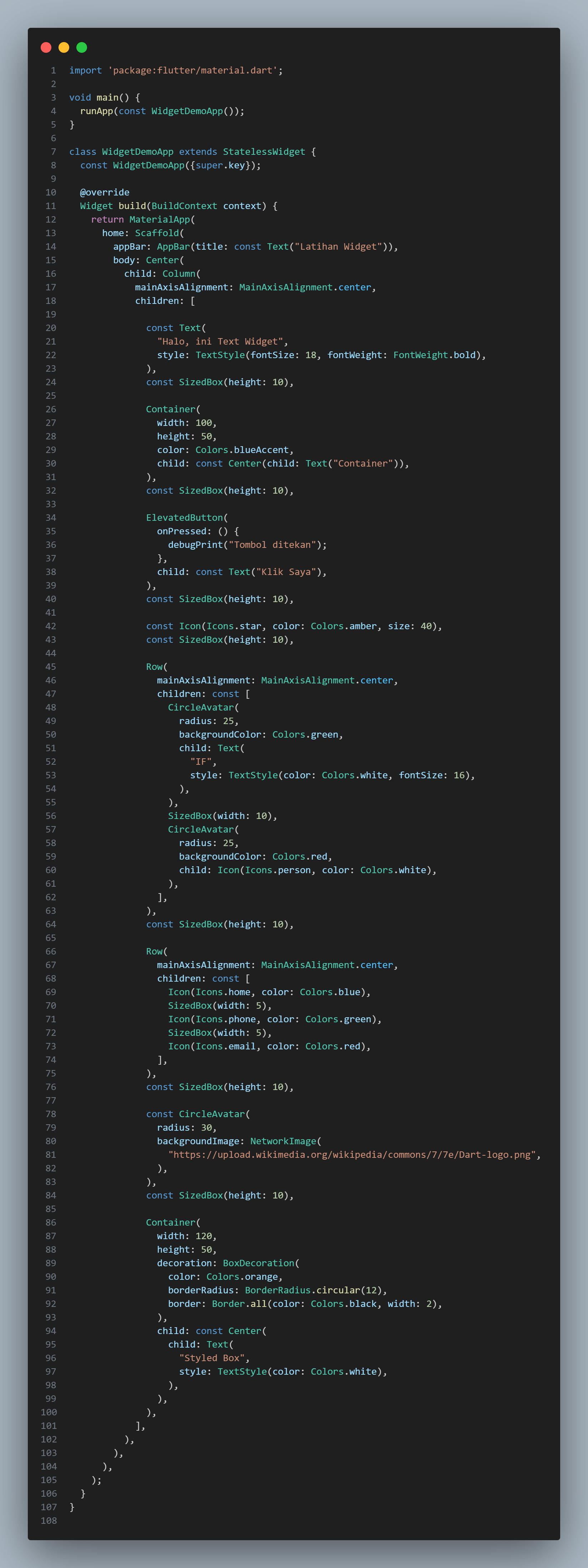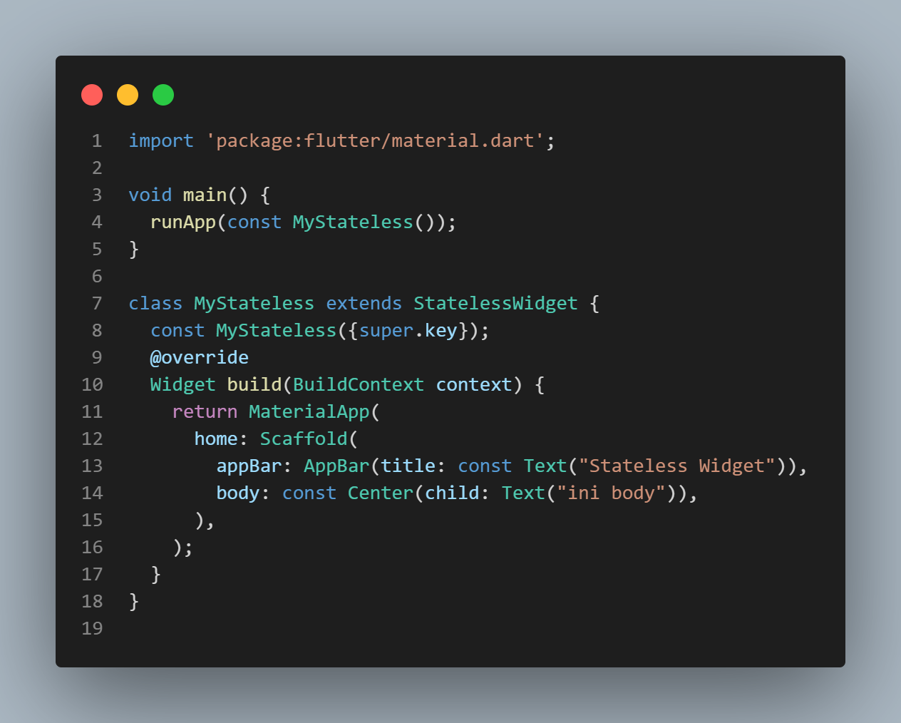 Stateless Widget adalah widget statis yang tidak berubah. Contoh kode: