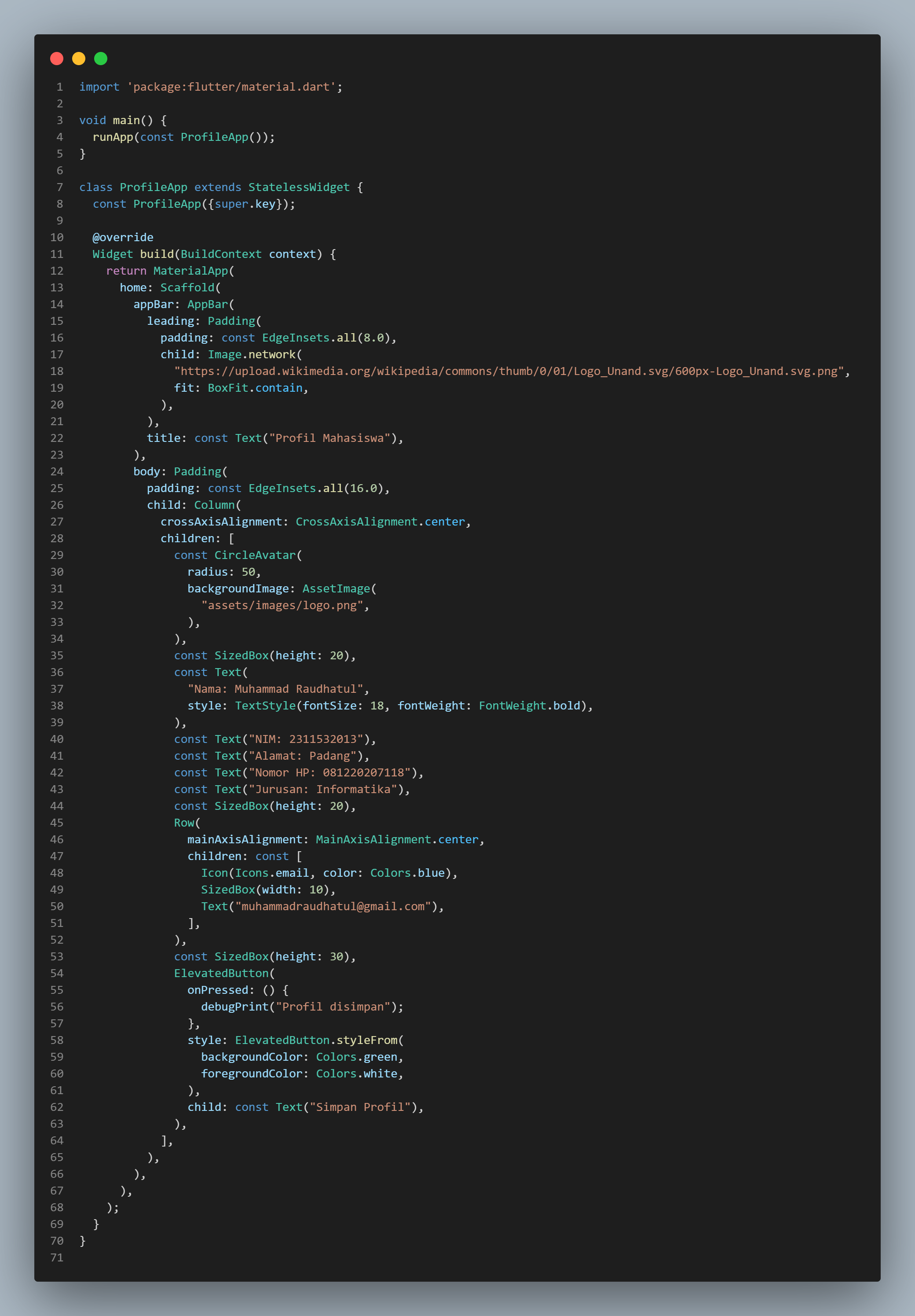 Pada praktikum ini mahasiswa berhasil melakukan instalasi lingkungan Flutter, membuat project pertama, memahami perbedaan Stateless dan Stateful widget, serta mengimplementasikan berbagai basic widget Flutter dalam bentuk tampilan sederhana dan latihan aplikasi profil.
