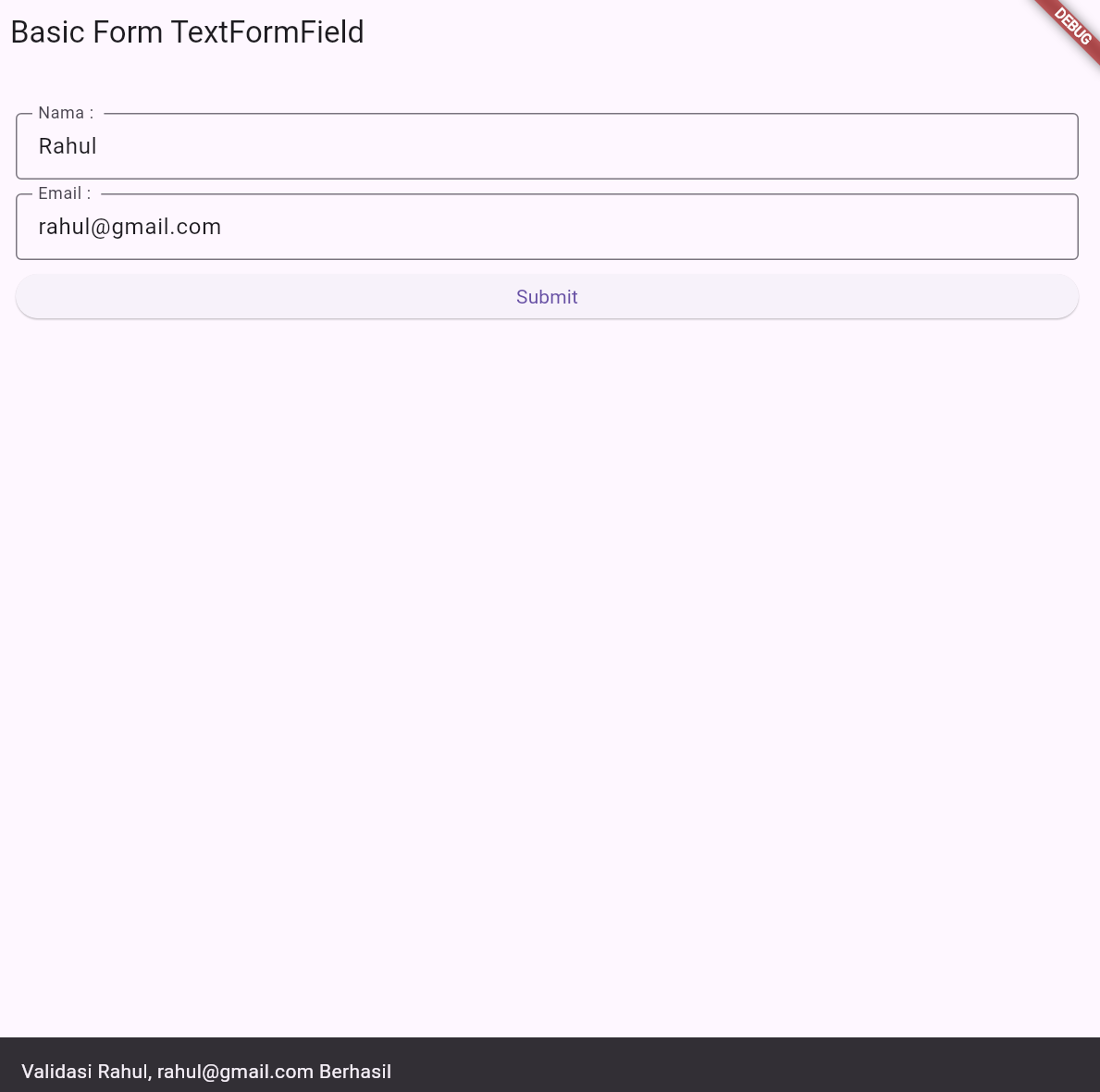 - Menampilkan pesan hasil validasi menggunakan SnackBar.