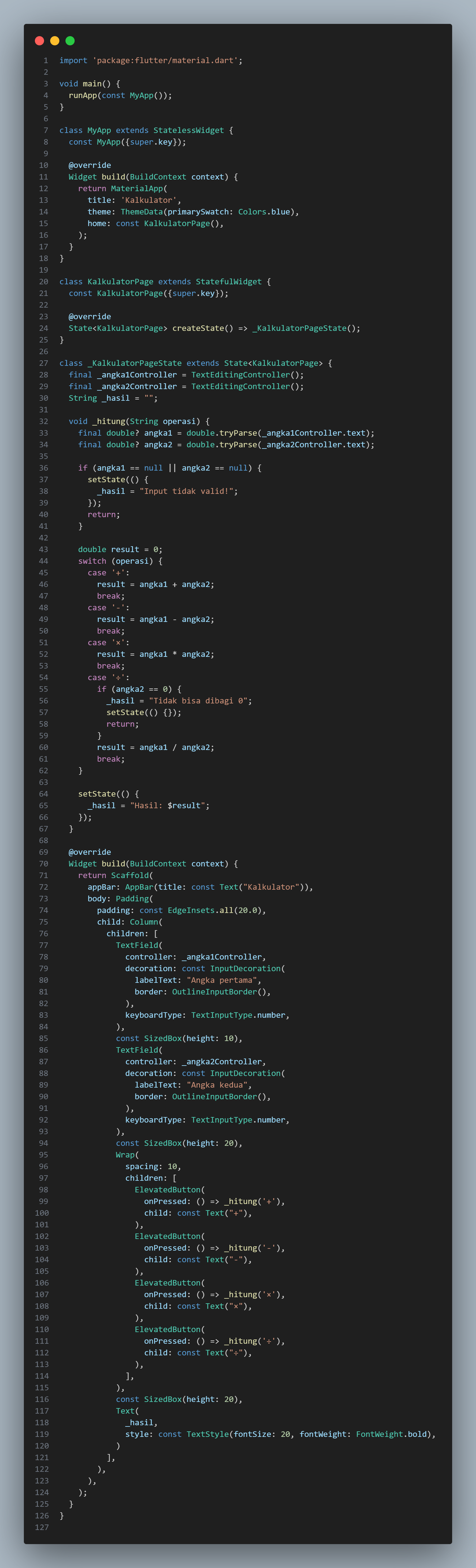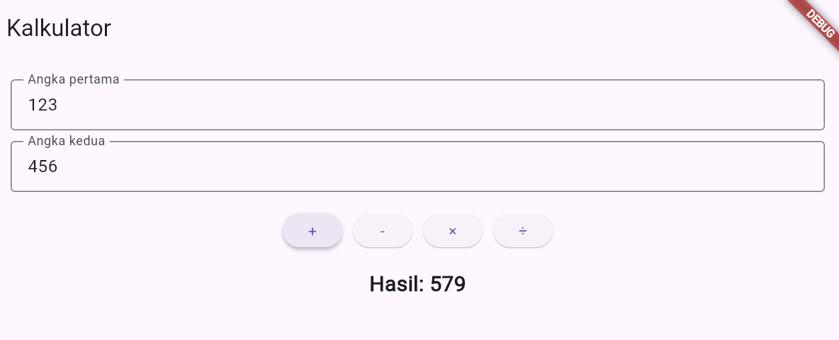 FormdanGlobalKey<FormState>. - Mengimplementasikan aplikasi kalkulator sederhana (kabataku: kali, bagi, tambah, kurang).